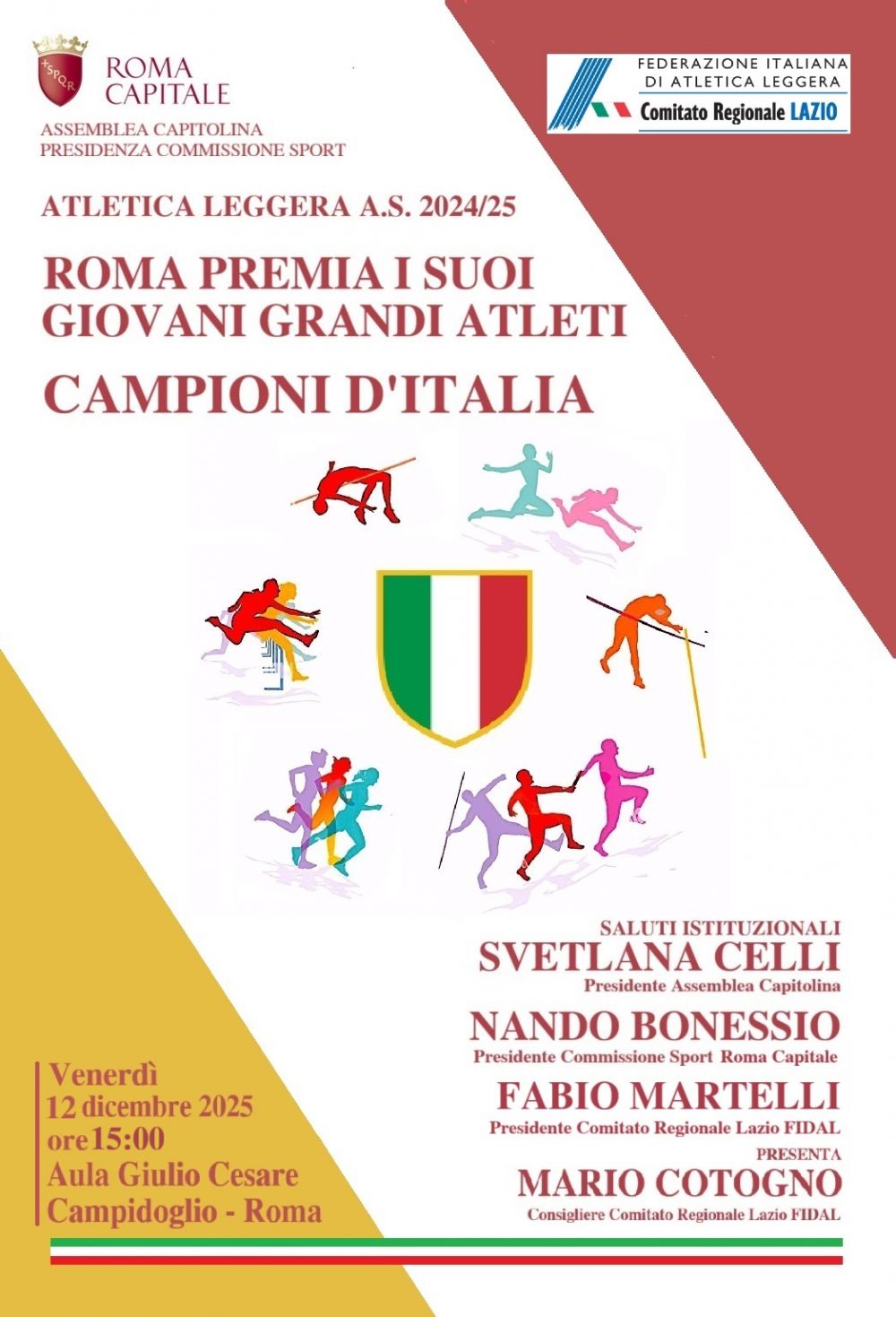 Ad ospitare gli atleti, il Presidente della commissione sport di Roma Capitale Nando Bonessio, con la presenza a dar lustro del Presidente Fidal Lazio Fabio Martelli e delle signore Manuela Mennea e Chiara Cacchi.